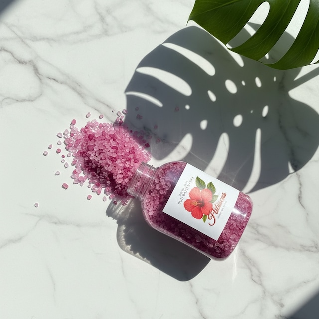 -日常を抜け出す、花ひらくひととき- 忙しい一日を終え ふと鏡に映る自分に 「おつかれさま」と言いたくなる夜。 そんな夜に選びたいのが 華やかに香るハイビスカスのバスソルト 湯気とともに広がる どこか南国を思わせるやさしい香り あたたかな湯に身をゆだねると 心までゆっくりほどけていくような感覚に包まれます 天然素材のみを使用 鮮やかなピンクの結晶が バスタイムを特別なリゾート時間へと変えてくれます 慌ただしい毎日だからこそ ほんの少しの非日常を 「今日は自分を大切にできた」 そう思える夜のお供に ※天然素材のため、多少の色の変化が生じる場合がございますが、品質に問題はございません。 ※入荷時のソルトの状態によって粒の大きさが異なり、量の見え方が変わる場合がありますが、内容量に変更はありません。 《 成分表 》 塩湖水塩、ハイビスカス 《 ご使用方法 》 バスタブにキャップ約3杯分を目安に入れて、よくかき混ぜてください。 お好みに合わせて量を調整しながら、ゆったりとした癒しの時間をお楽しみください。 《 内容量 》 330g 《 ご使用上の注意 》 ◎お肌に合わない時はご使用をお止めください。 ◎ご使用中、ご使用後にお肌または体調に異常が現れた場合は、直ちに使用を中止し医師にご相談ください。 ◎自然の原料を使用していますので、一部不純物が混入している場合もありますが、品質には問題ございません。 ◎追い焚き機能付き浴槽、保湿機能付き浴槽、ジェットバス機能付き浴槽でのご使用の場合、使用機器の説明書をご確認の上ご使用ください。 ◎塩の塩分により浴槽、風呂釜、排水溝周辺などの金属部分が錆びる恐れがありますので、ご使用後はよく洗い流してください。
